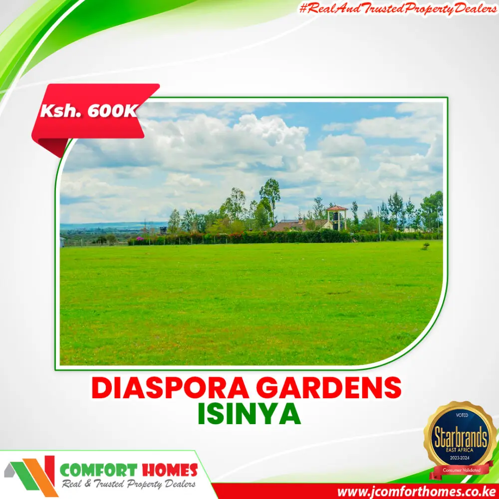 Diaspora Gardens, Isinya is located next to the Diaspora Village Resort and only 1KM from the Isinya Konza Bypass. The project consists of 1/8th acre plots selling at Ksh. 600,000 with access to electricity and boreholes. Diaspora Gardens, Isinya is ideal for residential and poultry farming purposes. Setting up a ranch or a green-house project is also ideal.