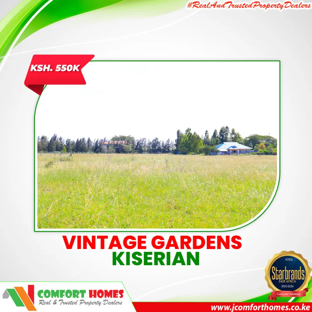 Vintage Gardens, Kiserian Phase 1 to 4 is located 7KM from Kiserian – Isinya Highway. The project consists of affordable an 1/8th acre (50 by 100) plots selling at Kshs. 550,000.