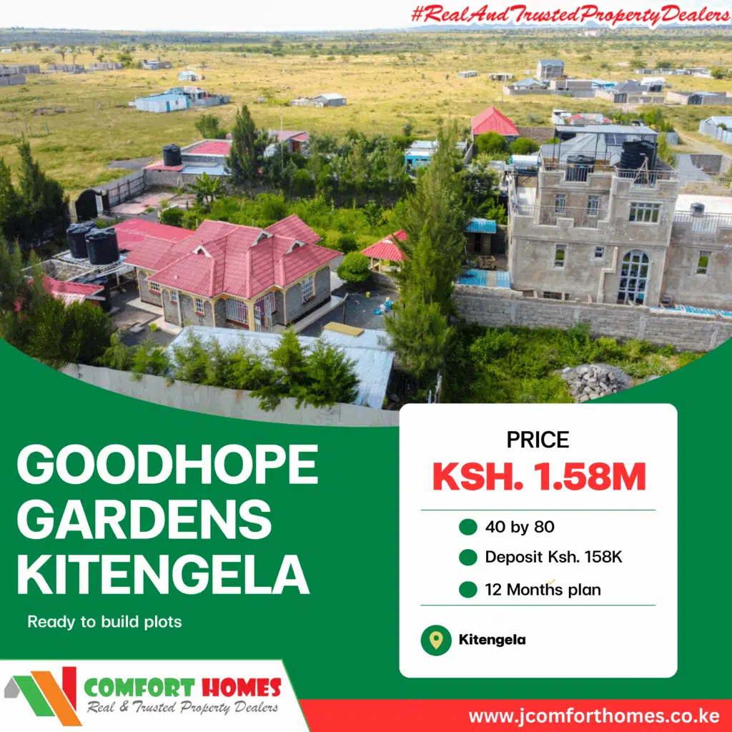 Good Hope Gardens is located 2.5KM off Namanga Highway and 4KM from Kitengela town. The project consists of 40 by 80 selling at an affordable price of 1.58M. We have an installment offer of up to 12 months for this plots in Good Hope Gardens in Kitengela.