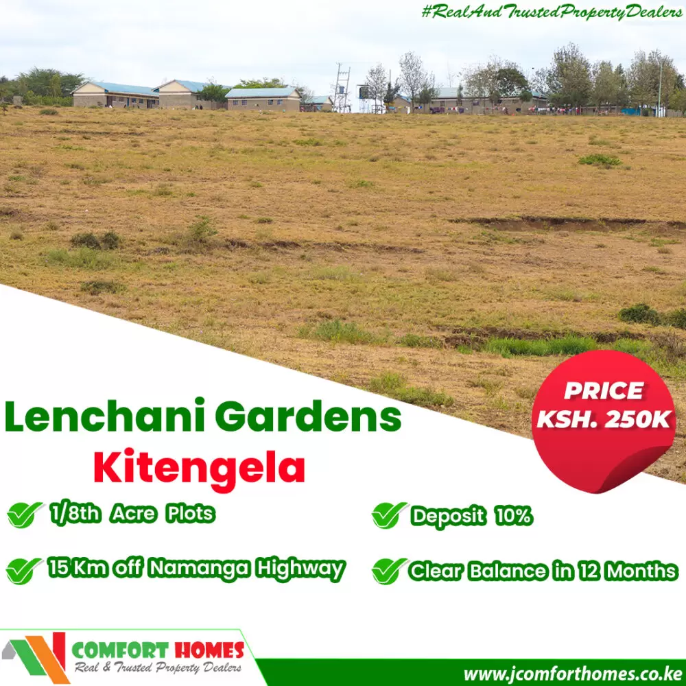 The plots at Lenchani Gardens sell at Ksh. 250,000 only. Make a deposit of Ksh. 25,000 and clear the balance in 12 months. Remember with a 10% deposit you can fence your land, and with 50% deposit you can start building your home.