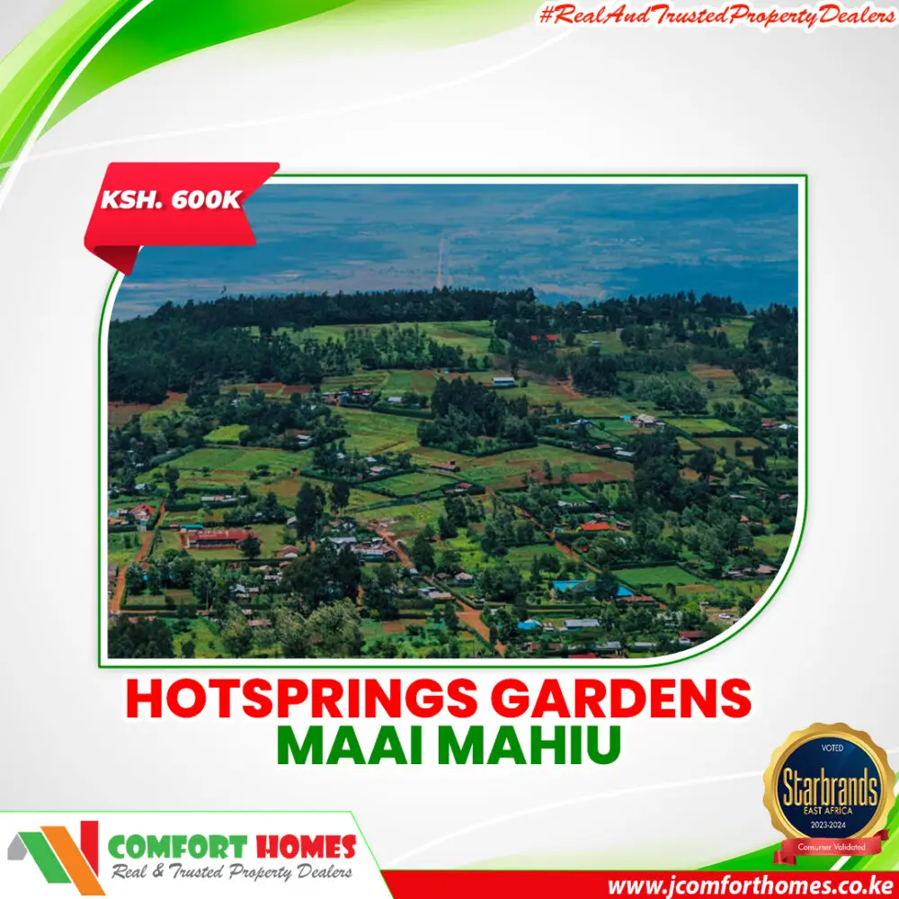 Hot Springs Gardens, Maai Mahiu is located 2KM from Maai Mahiu Naivasha Highway. The project consists of affordable an 1/8th acre (50 by 100) plots selling at Kshs. 600,000.